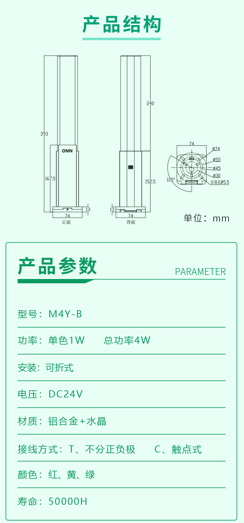 产品名称:欧恩照明 ONN-M4Y-B水晶三色警示灯 玻璃灯体 可自定义雕刻LOGO
